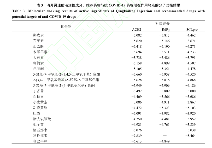“清开灵注射液的活性成分刺槐素等可顺利获得作用于CASP3、CASP8、FASLG等靶点调节细胞凋亡通路及TNF通路,从而实现对新型冠状病毒肺炎的潜在治疗作用。”这一中药抗病毒新证据,清开灵注射液可用于治疗新型冠状病毒肺炎的新成果,近期被成都中医药大学民族医药学术传承创新研究中心、民族医药学院、药学院合作研究发现,并在国家级期刊《中草药》上发表,该期刊核心影响因子1.878。