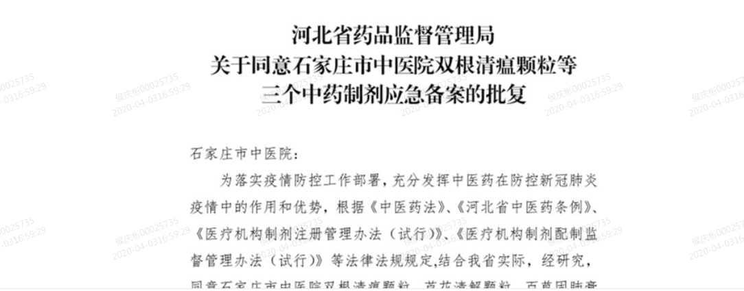 近期,河北省药品监督管理局下发文件,同意石家庄市中医药双根清瘟颗粒、芦花清解颗粒及百草固肺膏三个产品在河北省内用于新冠肺炎的治疗,其中明确双根清瘟颗粒、芦花清解颗粒由神威药业集团中药配方颗粒进行配制。